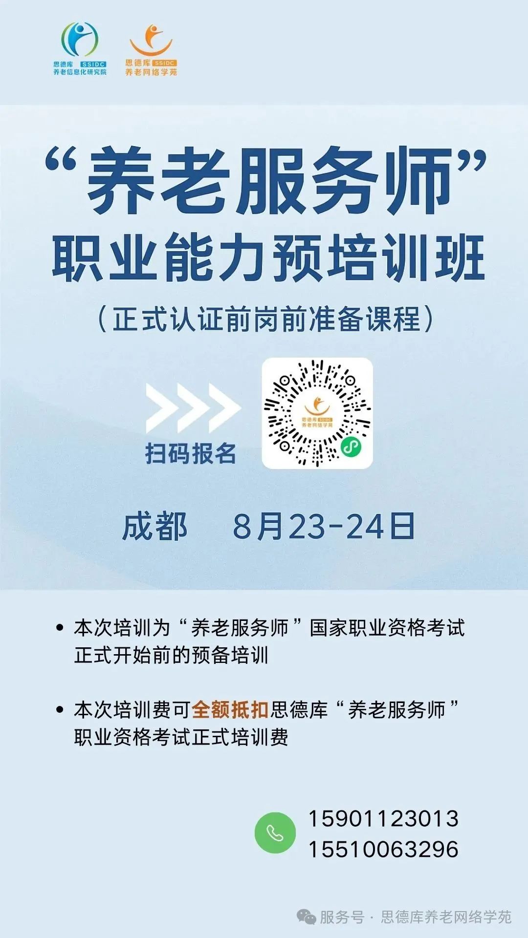 8月7日,思德库研究院与老龄社会30人论坛联合举办“从‘养老服务师’看老龄社会新职业前景”专题研讨会,邀请政策研究者、行业专家、一线从业者,围绕“养老服务师”新职业的内涵、现状及未来发展进行探讨,线上线下超4.8万人参会,反响热烈。 落地培训启动:思德库开启养老服务师培育“第一站” 为响应广大养老同仁对于“养老服务师”的学习需求,思德库研究院与孝行天下四川孝行天下文化传播有限责任公司、锦欣百花锦园康养社区于2025年8月23日-24日在四川省成都市举办首期“养老服务师”培训。 此次培训也是思德库第25期养老经纪人培训,作为“养老服务师”国家职业资格考试正式开始前的预备培训,培训费可全额抵扣思德库“养老服务师”职业资格考试正式培训费(四舍五入等于免费学习预习课) 扫描下方二维码即可报名: ![]() 精彩内容前瞻 思德库研究院作为行业先行者,基于多年养老专业人才培养的研究、培训实践,由田兰宁博士领衔设计课程,紧密对标“养老服务师”七大职责(需求评估、方案制定、照护指导、质量管理、资源链接等),通过“政策理论+场景实战+资源整合”三维赋能,助力学员抢占职业发展先机。 ✅ 权威专家授课:田兰宁博士领衔专家团队,课程融合2025年国家“养老服务师”新职业能力要求